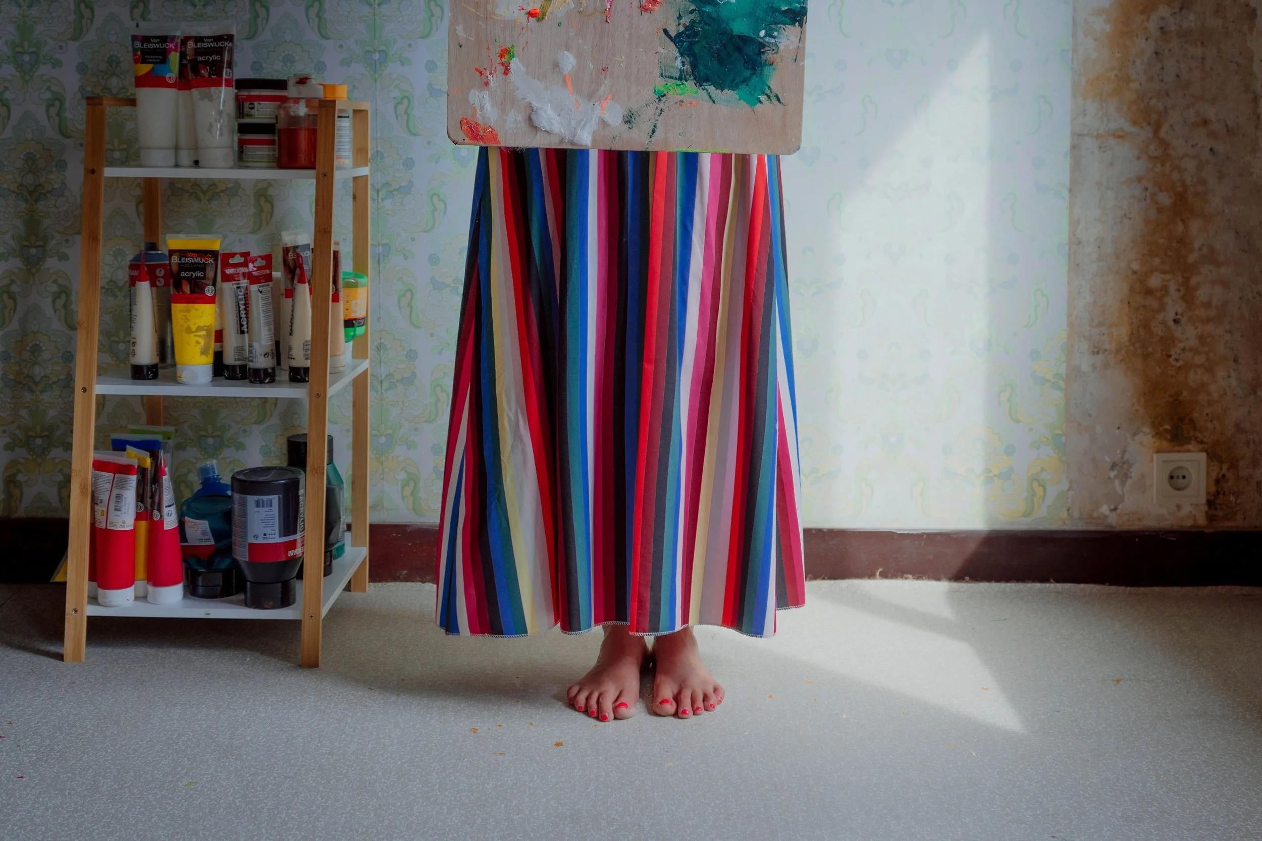 The result was a fascinating dialogue between two disciplines, the fluid spontaneity of abstract color and the intimate presence of figurative form, blending on a single canvas into a work that feels both contemporary and deeply human.
